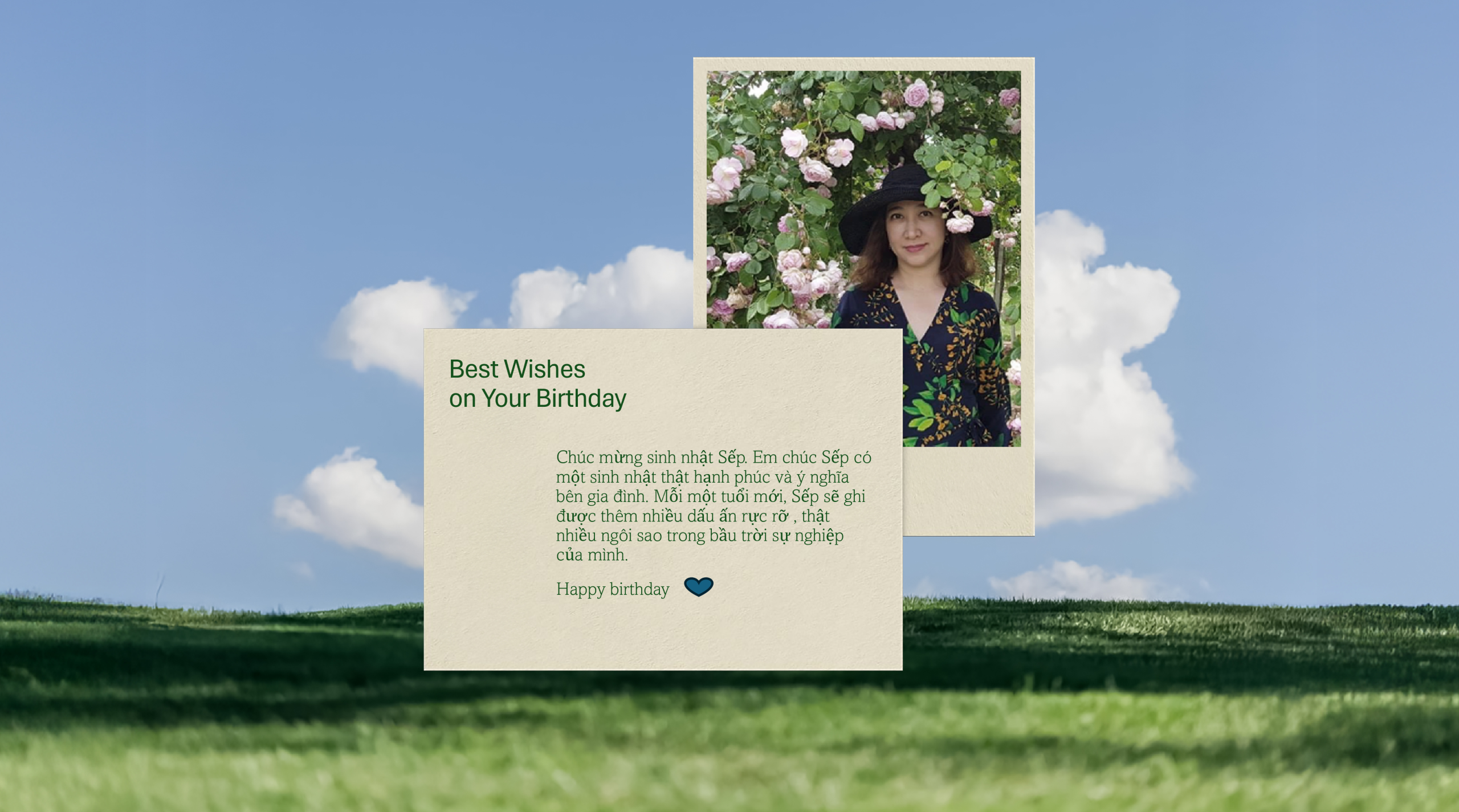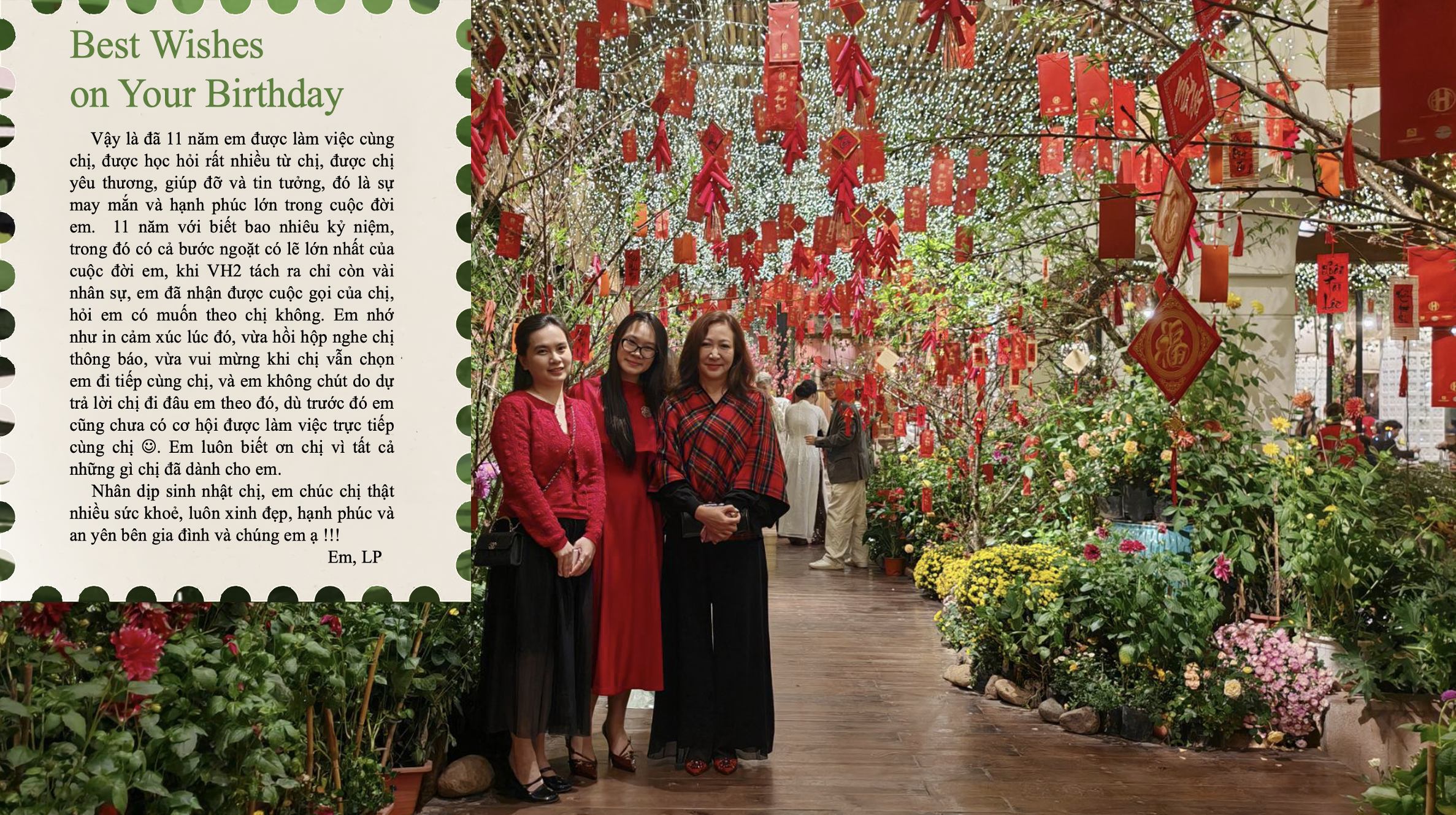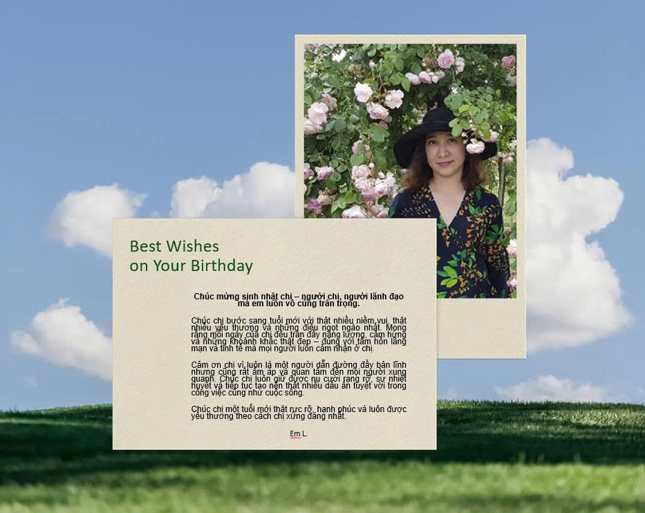 Mong chị luôn giữ được sự thảnh thơi trong tâm hồn, hạnh phúc với những trải nghiệm mới và tiếp tục là người truyền cảm hứng bất tận cho tất cả chúng em.